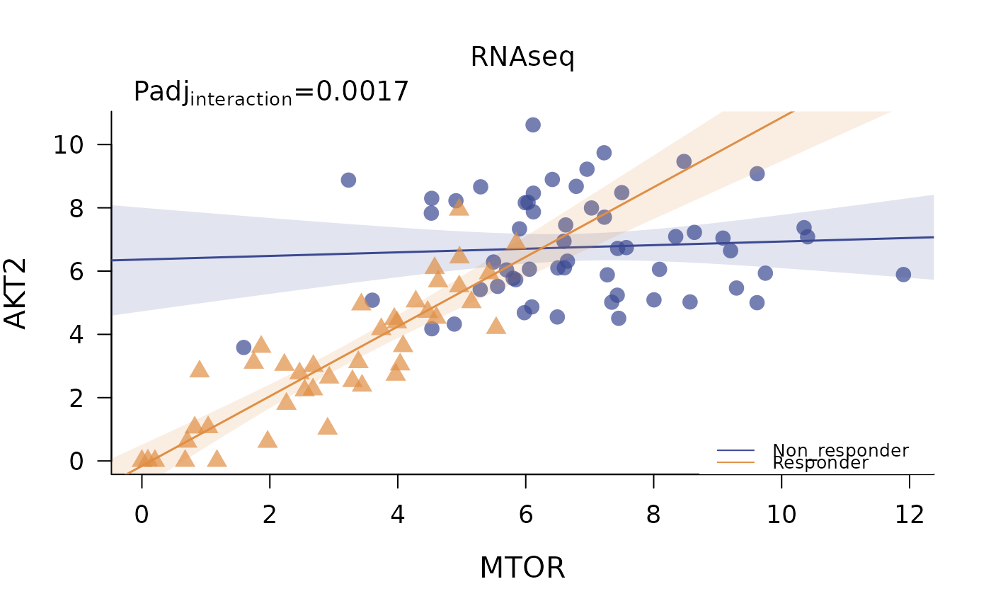 base graphics plot showing differential regressions across categories. The p value of the interaction term of gene A ~ gene B \* category is reported on top.